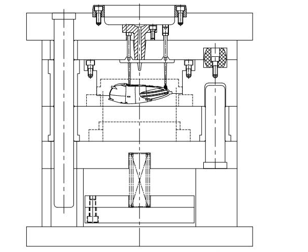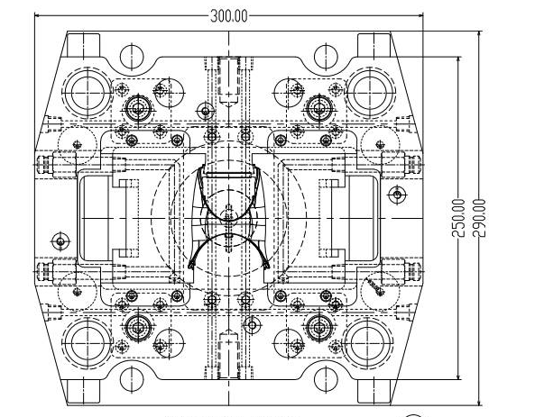 兩套模胚的雙色模具,具有兩個完全相同的后模,而兩個前模型腔是不同的,用于注射不同的物料。這就要求兩套模胚完全相同,由于需要互換配合,模胚需要具備很高的精度。一般要求模具的加工精度在0.01以內(nèi)。注意模胚的導柱導套孔仍然需要基準角偏置,以防加工時出錯,和普通單色模具一樣。另外一點需要注意的是模具必須設計成三板模的形式,在一次注塑后,二次注塑前,水口料需要及時分離。